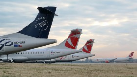 ...smutný pohled na odstavená letadla ATR poblíž hangáru F, v pozadí pak na dráze 22 odstavený Airbus A-330 "OK-YBA"