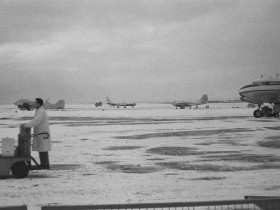 Provoz na starém letišti - přistání letadla Tu-104 na RWY 04 s brzdícími padáky (v pozadí), cateringový vozík, na odstavné dráze je Dakota, směrovka patří letadlu IL-12, v pravé části pak čs. vojenská Avia-14. Na příďi je k vidění DC-6 KLM, ze které ručně vykládají poštu