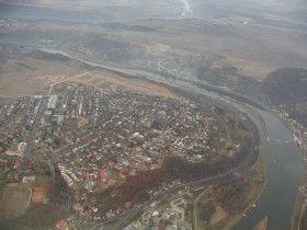 Pohled na město Roztoky u Prahy během přiblížení k dráze 24