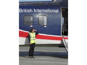 Letuška British International Helicopter vyhlíží cestující dalšího letu (odbavení probíhá bez vypnutí rotoru, proto nezbytná sluchátka).