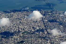 Pohled z letadla na centrum San Francisca těsně před přistáním letu DL1765 z New Yorku