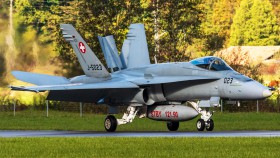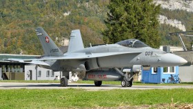 Śvýcarský Hornet F-18 krátce po přistání, roluje po pojížděcí dráze souběžné s runway zpět na stojánku. Letecká základna Meiringen je sídlem 11. squadrony Swiss Air Force.