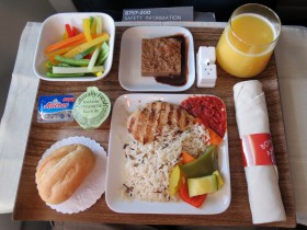 • Na dálkových linkách KLM z Amsterdamu si cestující může za příplatek zvolit hlavní jídlo z "a la Carte" menu. Toho jsem využil na lince do Limy a zvolil jsem Captain´s Choice, což kromě krásného balení v černých krabičkách s imitací kůže bylo i velmi dobré a lepší než klasicky nabízené "Chicken or pasta". Jednalo se o mini řezy s rybou a chřestem a hovězí s bramborem.